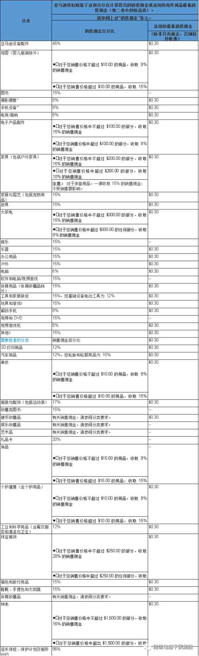以上表格,就是亚马逊美国站的各个类目佣金销售百分比情况,会发现从8%-45%都有,相差还是挺大的。
