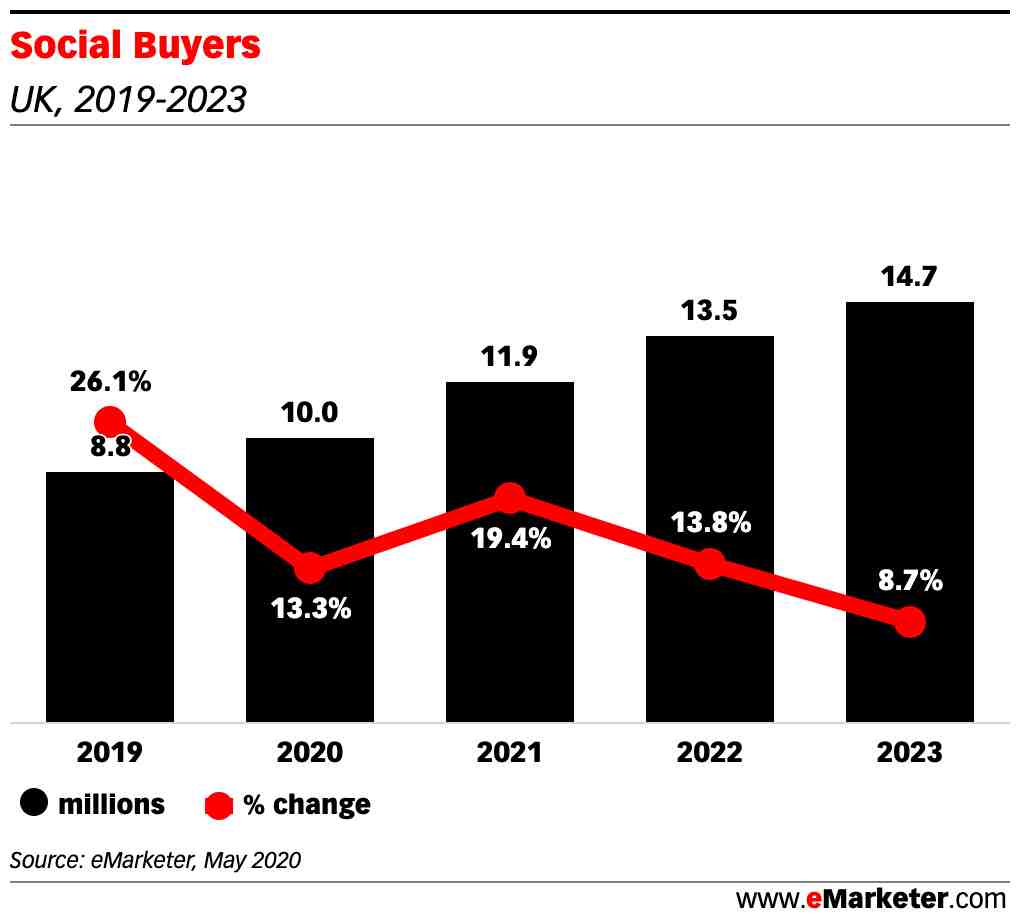 如前所述,预计随着英国消费者可以使用更多的社交功能,增长或将继续上升;其中包括Facebook Pay(有人预测将于2021年在欧洲推出),以及Instagram Checkout--购物者不仅可以查看品牌帖子中的产品信息,还可以通过点击 "在Instagram上结账 "按钮进行购买。上个月,Facebook宣布推出Facebook Shops,这将使促进更多企业在线上建立一个在线商店,并且消费者能够在Facebook和Instagram上进行访问。虽然目前还不确定英国企业和消费者何时可以使用这一功能,但我们相信这将会是社交平台用户增长背后的另一个促进因素。