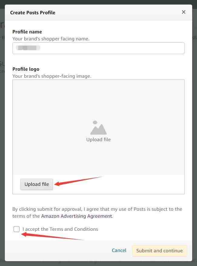 第四步,上传一个品牌logo图片,尺寸要求是400x400像素。然后点击【I accept the Terms and Conditions】,再点击【Submit and continue】