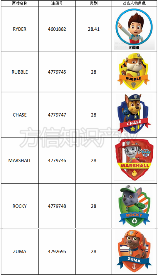 商标方面,除了Paw patrol为主打美国商标,品牌方将所有动画人物名称注册为商标。