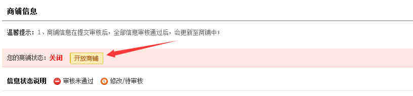 如果您需要暂时关闭商铺,可以点击“关闭”商铺按钮。此时,买家还可以搜索并查看您的产品,只是无法访问您的商铺;如需再次恢复只需点击开放商铺按钮即可。
