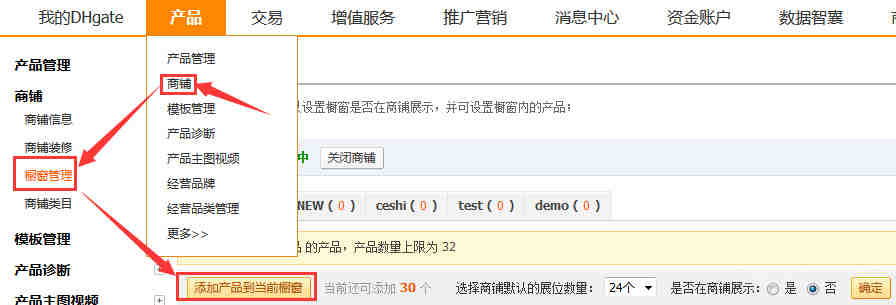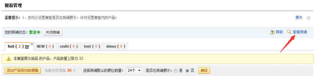 店铺创建成功后,可以选择产品添加到橱窗。如图所示: