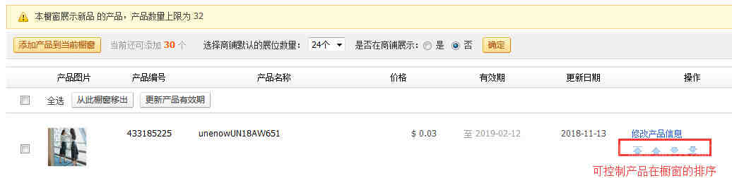 产品加入橱窗后,可以调整产品的显示顺序。卖家自己定义的产品顺序,就是买家访问店铺时看到的产品显示顺序。