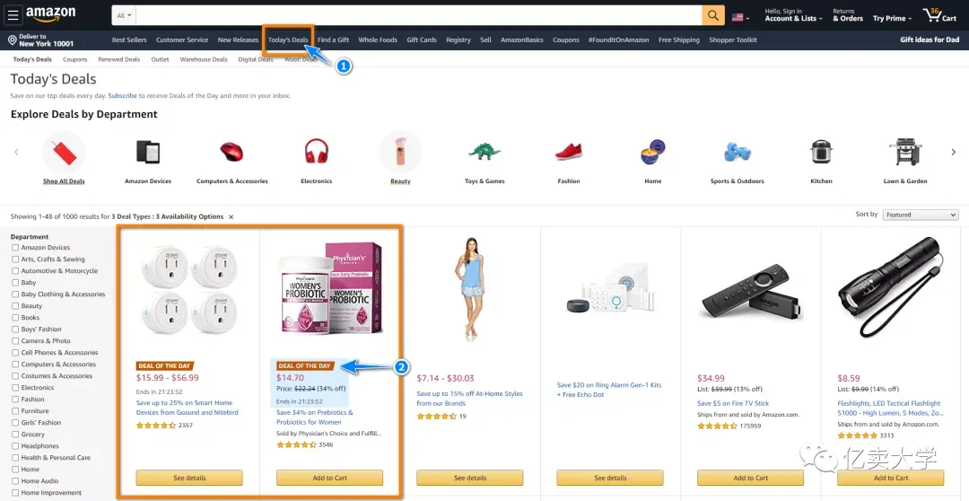 Deal,也被称为秒杀活动,平时在浏览商品页面时经常可以看到一些秒杀活动。在亚马逊前台,页面导航【Today's Deals】为消费者集中展示了不同品类与秒杀类型的产品。