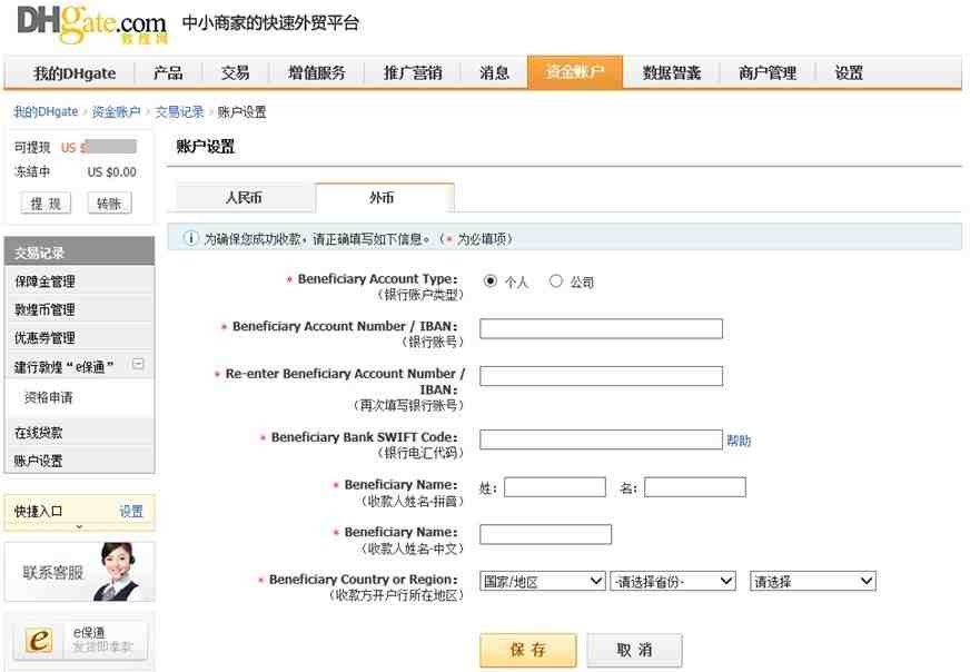 登录到"我的DHgate"--" 资金账户"--"账户设置",就可以直接看到需要填写的内容,包括"外币账户"和"人民币账户"信息。
