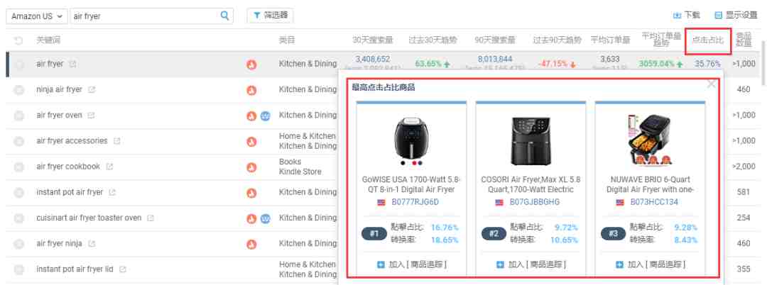 同时还会显示关键词过去30天的实际搜索量、使用此关键词搜寻后前三项被点击查看的商品以及订单转化率。以此帮助卖家轻松获取海量关键词,精准定位潜力商品。