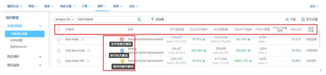 其中,全年热搜关键词可以帮您快速搜寻整年来都有维持一定搜寻热度的商品;新进热搜关键词则可以帮您发现近期热卖的商品;而季节性关键词可以帮您筛选出季节性明显的商品。