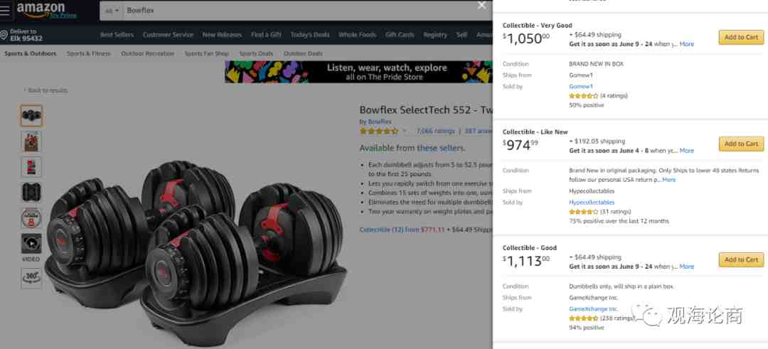 "亚马逊方面并没有很好的定义,没有明确的定义什么是定价上限,也没有明确的定义或者说定价上限是如何计算的。"Marketplace Pulse的Juozas Kaziukenas说,他也遇到过1000美元的收藏型Bowflex哑铃产品。