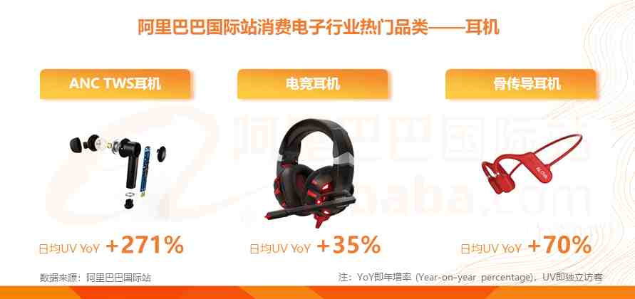 消费者心智教育已完成,区分使用场景下的专业级耳机设备更受关注。无论是在 TWS 真无线基础上的ANC 主动降噪式耳机,还是专业的电竞耳机,或是骨传导耳机,都在平台上呈现出相当的市场规模增速,日均UV年增长分别达271%、35%、70%。