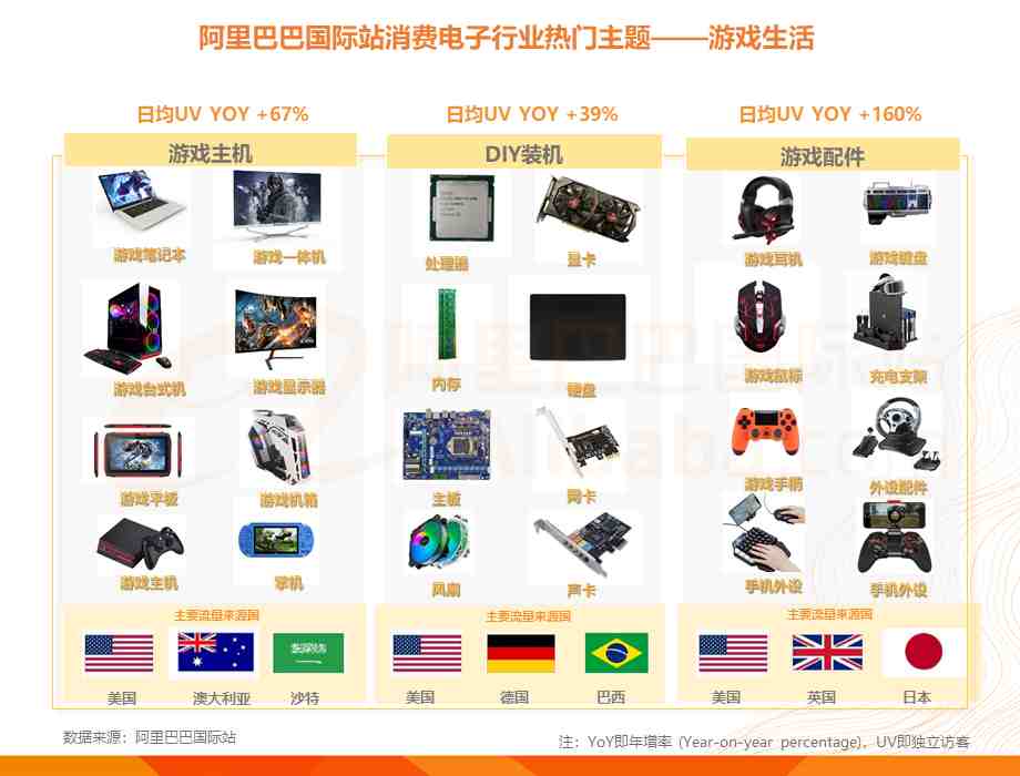 作为全球消费电子制造中心,截至目前,我国手机、计算机和彩电产量已占全球总产量的90%、90%和70%以上。疫情期间,人们居家办公及娱乐的时间增多,与之相关的电子设备和配件需求随之上升。包括手机、电脑、耳机、家庭影音、游戏机、智能电子设备等产品,在阿里巴巴国际站上成为热门搜索。