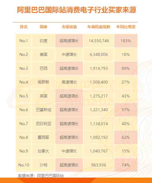 印度市场为平台上的TOP 1 消费电子产品买家来源,并保持着183%的超高速增长,且年商机量指数也遥遥领先于其他欧美发达国家。巴西、巴基斯坦、尼日利亚、墨西哥等发展中国家的买家,也展现出对中国消费电子产品的高涨热情。