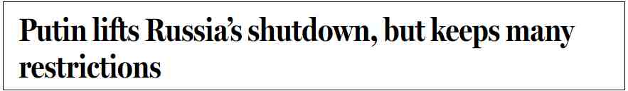 虽然普京宣布俄罗斯全国和所有经济部门的“非工作日”时期结束,但是强调战“疫”工作并未完结,“即使在一些形势相对较好的地区,其危险性仍然存在”。
