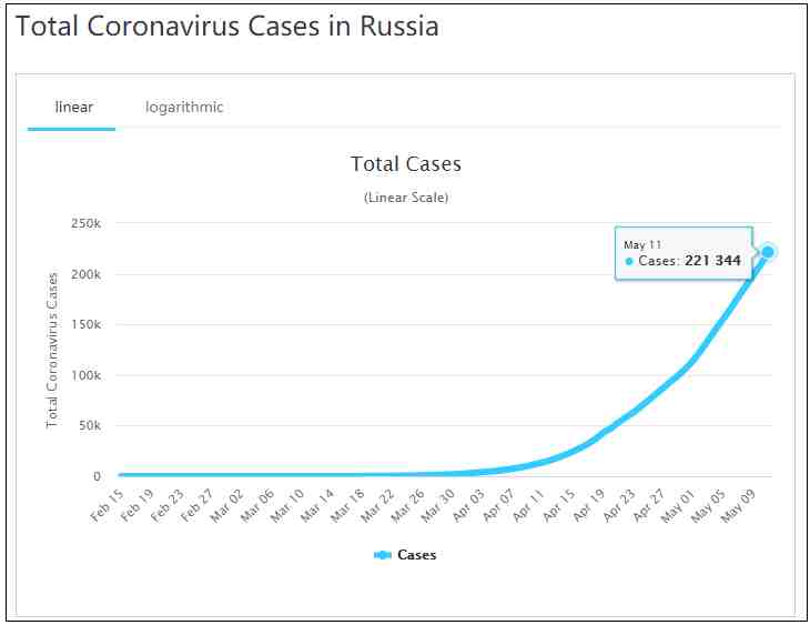 目前,俄罗斯确诊病例总数已超英国和意大利,成为全球确诊人数第三高的国家。