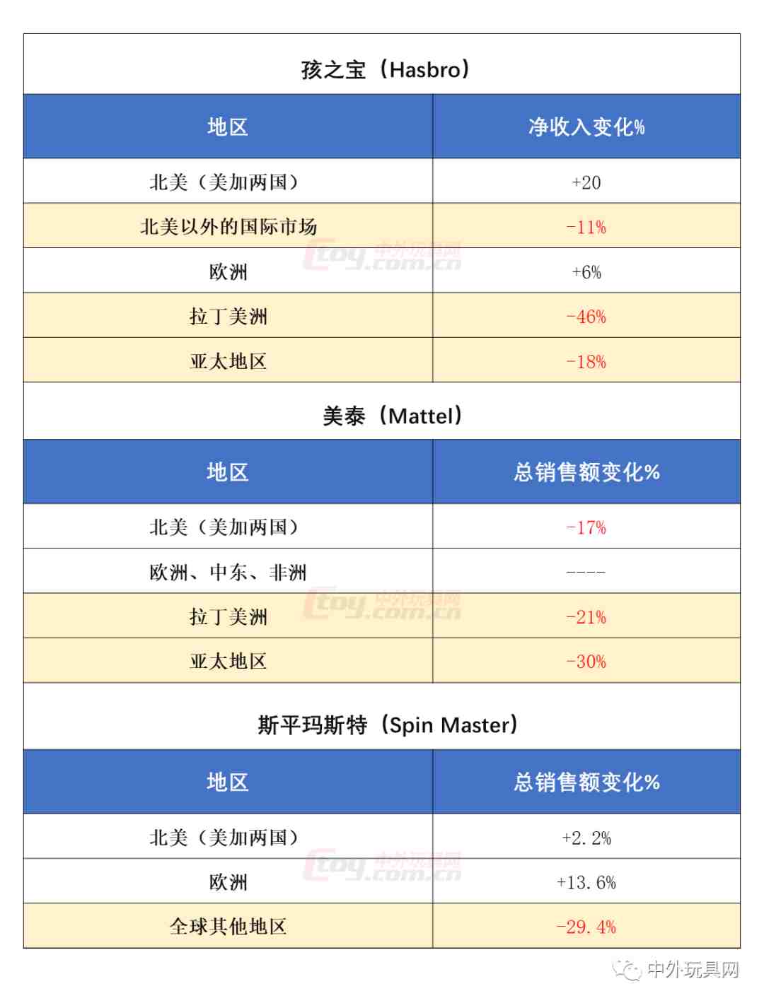 根据全球数据调查公司NPD集团最新发布的玩具销售数据显示:纳入其调查范围的全球13国在今年第一季度整体销售增长4%。其中,增幅最大的是澳大利亚(+11%),其他增长的国家还有德国(+8%)、美国(+7.6%)、俄罗斯(+6%)、英国(+2%)和墨西哥(+1%)。其余7个国家则录得了下跌。对此结果,NPD集团全球玩具行业分析师Frédérique Tutt表示,大部分增长源于居家隔离新增的娱乐需求。由于大部分地区因为抗疫需求,售卖非必需品的商店陆续关门,玩具订单向线上转移,那些靠近社区,并且可以提供无接触送货服务的玩具店反而受益。目前已经公布第一季度业绩的三家国际玩具巨头都表示,销售虽然增长了,但是全球的收入却不涨反跌。按跌幅排名由高到低分别是:美泰(-14%)、孩之宝(-8%)、斯平玛斯特(-4.9%)。主要原因在于需求并不均衡。下面我们就会详细说明。从三大国际玩具巨头公布的第一季度业绩数据看见,增长主要集中在欧美地区,也是上文提及的玩具销售见涨的火车头,而亚太、拉美等新兴市场表现并不如人意,拖累收入下跌。从上面的表格可以看出,亚太和拉丁美洲这两大新兴市场板块,都比较疲弱,而欧美地区都是所属公司第一季度表现较好的地区,这和疫情在这两地爆发较晚(3月中下旬,影响相对有限)、且游戏文化较为浓厚有关。因为宅在家里的欧美人,最爱买来打发时间的玩具产品,就是游戏拼图。从之前的一些零星报道就可以知道,游戏拼图类是疫情期间的最大黑马,紧随其后的品类是户外与运动玩具。在美国,NPD集团的数据就显示,游戏拼图、户外和运动这两类玩具贡献了77%的玩具销售增长额。细分来看,游戏拼图类主要是面向家庭亲子的桌游,面向大人的拼图和卡牌游戏;面向儿童的游戏产品;户外和运动方面,有儿童溜冰鞋、滑板车和儿童水池。在英国,户外和运动玩具则贡献了最大比例,主要是由于夏天快到了,家长希望孩子可以多运动。但因为学校活动停止,于是在自家后院进行活动成了时髦。而玩具巨头的细分品类业绩也印证了上述情况。孩之宝的游戏类产品大幅增长30%;美泰旗下以UNO卡牌和AR版你写我猜代表的游戏产品大卖。斯平玛斯特活动、游戏、拼图、玩偶类综合门类受游戏类和动力沙热卖带动,也增长24%。虽然游戏户外产品的销售红红火火,但如果以品牌的维度来看,以惊喜娃娃、小泰克、热火、风火轮等大牌为主,前十大品牌贡献了19%的销售增长额,其余所有品牌的增长额贡献率仅仅5%。可见销售主要集中在知名大品牌。新兴小牌比较艰难。根据NPD集团的最新数据,增长较快授权品牌依然是榜单常客:迪士尼旗下的"三大吸金王":冰雪奇缘、星球大战、漫威,还有一个是来自日本的精灵宝可梦。话虽如此,但迪士尼的日子并不好过。根据其最新发布的财报,衍生品的总体收入较去年同期下滑了7.7%,其中衍生品授权的收入少了2%。主要是受到影视作品播映档期延期影响。和去年同期相比,今年迪士尼的热门电影比较少,本来应该上映的《花木兰》因疫情被迫改档,衍生品的授权和销售都受到了一定影响。● 迪士尼全球6大乐园因抗疫需要而关闭,米老鼠也愁眉苦脸孩之宝自身的电视、电影、娱乐部门收入同比大幅下跌29%,授权品牌收入轻微上升1%。美泰方面,所获授权热度不如孩之宝。手握较受欢迎的玩具总动员4授权,在电影热度过去之后,产品销售迅速回落。新的授权有小黄人和东京奥运会,但是都受到疫情影响而延期,产品计划也要进行相应调整,并没有获得预期的收益。受电影延期影响,全球大型角色扮演服饰公司Rubie's宣布,将根据美国破产法第11章申请财务重组。据悉,该公司手握迪士尼、漫威、华纳、尼克儿童频道等多个授权,有星球大战、哈利波特、DC漫画等系列授权服饰。疫情爆发前,公司购入新鲨鱼宝宝等新授权,期望2020赚一笔,但疫情爆发后,一些新推出的系列受电影调档影响销售。作为应对,该公司裁员75%,却依然无法缓解资金压力,最终申请财务重组。● 全球大型授权服饰公司因疫情影响,不敌资金压力,申请财务重组最新消息,全球最大规模的授权展,拉斯维加斯授权展,最终宣布取消。早前曾因为疫情从5月延期到8月,现在改在6月举办线上展会。这将在一定程度上影响新授权品牌的交易。种种迹象都表明,真正的考验在第二季度。因为海外疫情爆发在3月中下旬,对第一季度的负面影响有限。随着疫情发展,更多商店关门,企业裁员倒闭,失业人数上升。预计第二季度情况将更为严峻。