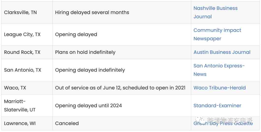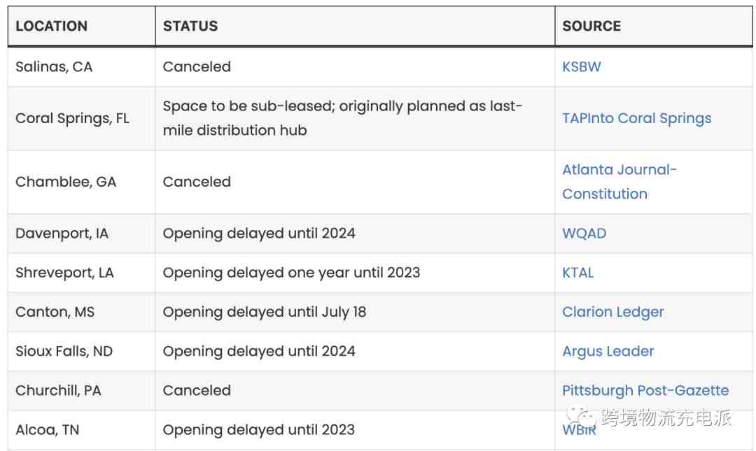 以下是亚马逊在 2022 年取消或推迟的 16 个计划仓库:
