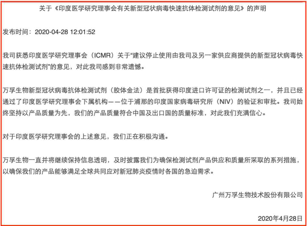 他们第一时间发布声明,表示“公司新冠病毒抗体检测试剂(胶体金法)是首批获得印度进口许可证的检测试剂之一,并且已通过了印度医学研究理事会下属机构——印度国家病毒研究所(NIV)的验证和审批。”