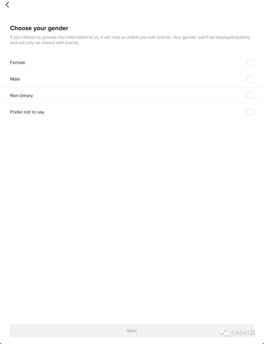 Step 4: 然后需要选择你的性别,选填完相应的内容之后,点击"Next"。