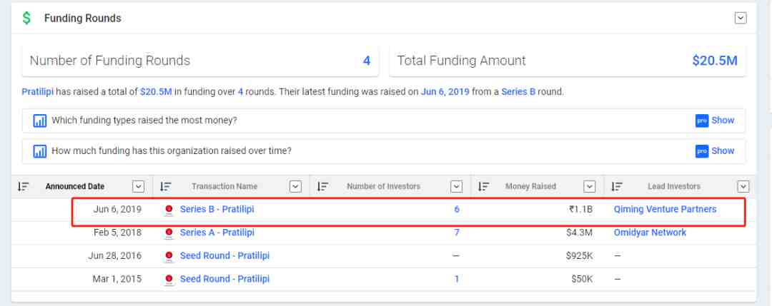此前,2019 年 6 月 Pratilipi 完成 10.4 亿卢比(约合 1500 万美元)的 B 轮融资,由中国风险投资公司启明创投领投,参投方包括雷军旗下的顺为资本。