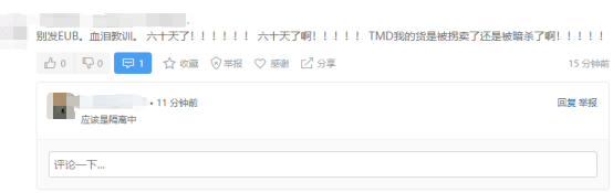 除了资费上涨之外,E邮宝近期运送时效也是大打折扣!有卖家表示:别发EUB,血泪教训!六十天了!六十天了啊!TMD我的货是被拐卖了还是被暗杀了啊!