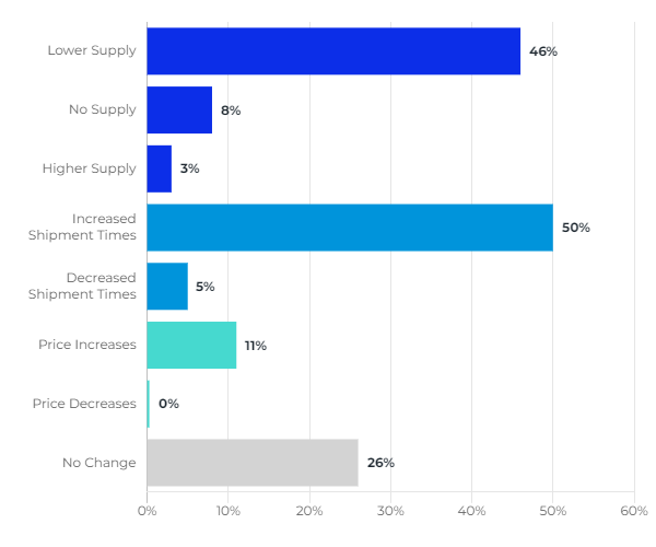 1. 运输和生产受到影响:50%的卖方认为运输时间受到负面影响,其中占比有46%的卖方反映货品的供应量均有下降。