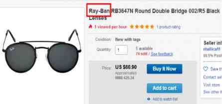 Luxottica Group S.p.A.是根据意大利法律组建的公司,主要营业地在米兰。Luxottica Group S.p.A.的主打品牌是RAY-BAN。RAY-BAN品牌于1930年创立,主要产品是太阳镜。在其注册商标中,卖家们最常在产品上及产品描述中使用“RAY-BAN”一词,如以下这位卖家就是如此: