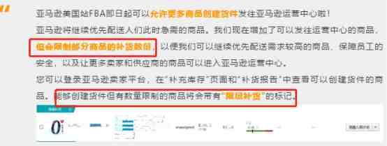 据了解,亚马逊现在仍然是继续优先配送需求较高的商品,所以目前能够创建货件但有些有数量限制,这些商品将会带有“限量补货”的标记。