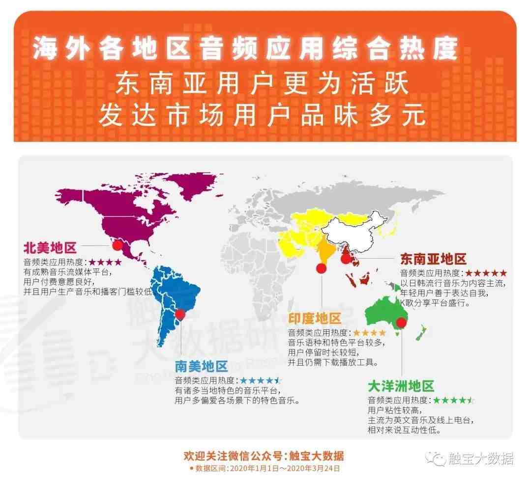 从 TOP30 音频类应用的综合热度来看,东南亚是对音频类应用青睐程度最高的地区,当地年轻用户以及刚刚培养起智能手机使用习惯的新用户都更容易对潮流音乐产生粘性,并且通过 K 歌平台低成本展示自我。其他活跃度较高的地区还有平均经济水平较高的地区,他们拥有成熟流媒体平台,此外也有崇尚节奏律动的南美地区和印度地区,他们当地的音乐流派特色突出,对音乐关注度较高,本土化应用发展较为发达。