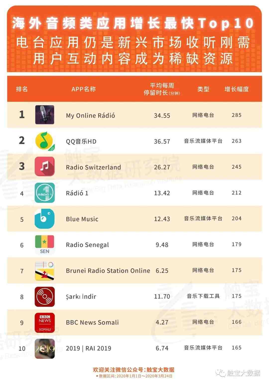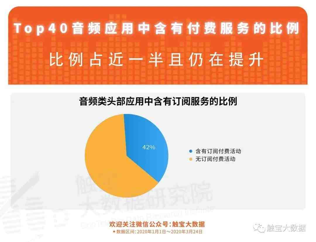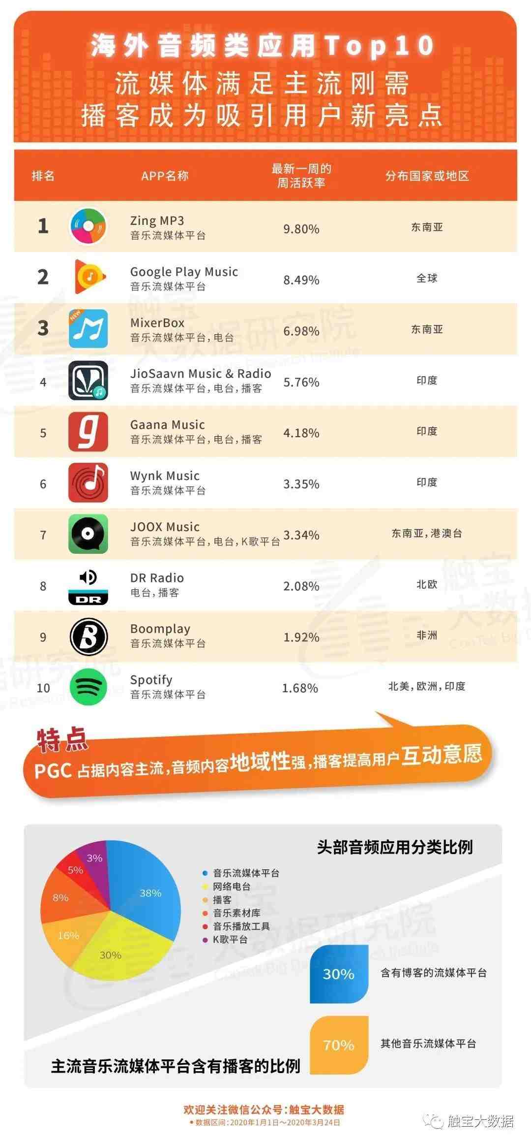 注:本次统计中,“音频类应用”以 Google Play 规定的音乐与音频分类为主,以阅读为主要需求的有声书类,以冥想解压音频作为功能音频的健康健身类应用不计入本篇报告的讨论范围。