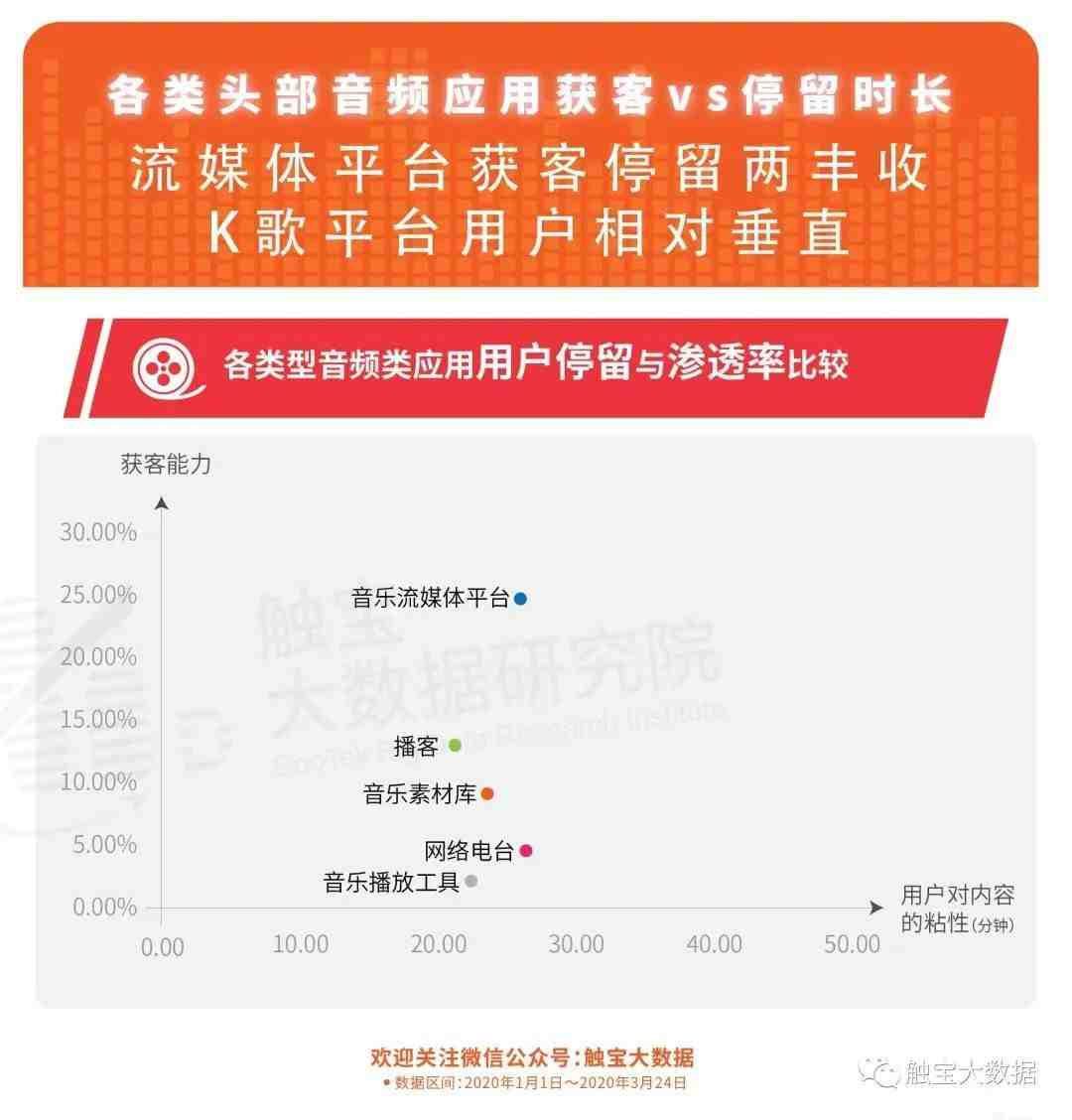 对用户的吸引力是成功平台发展的起点,也是平台上满足用户需求程度的衡量。但是用户的停留时间越长,转化消费的可能性就越高。从各类应用的平均活跃度与停留时长看来,目前成熟的音乐流媒体平台一方面通过满足用户的刚需收获了大量用户,且内容对用户粘性较高,因此对于消费转化有更多的机遇。而 K 歌平台收割的更多是长尾用户,用户需要一定的场景进行参与,因此活跃度会受到一定限制,播客两方面的能力较为平均,在用户粘性方面不及网络电台,可能因为内容优质程度和专业度受限。