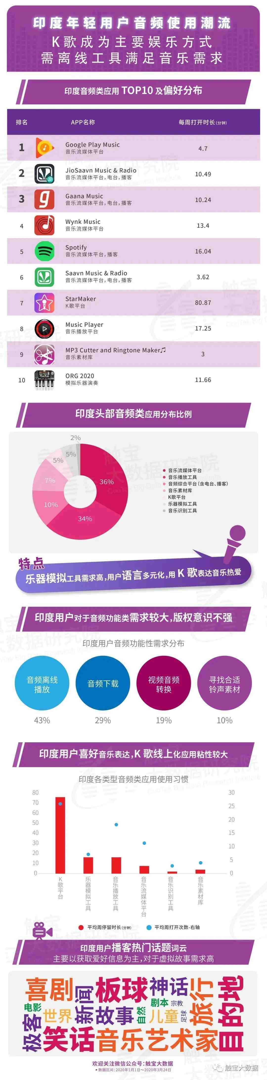 印度年轻用户比例较大,有较强的追求潮流音频的需求。但由于他们更愿意将音乐进行下载离线之后免费收听。因此目前主动付费意愿不强。相对而言他们更喜爱参与度较高的音频类应用,希望在网络上快速获得关注与认同感,因此 K 歌平台在当地及东南亚其他地区都有较大影响力。