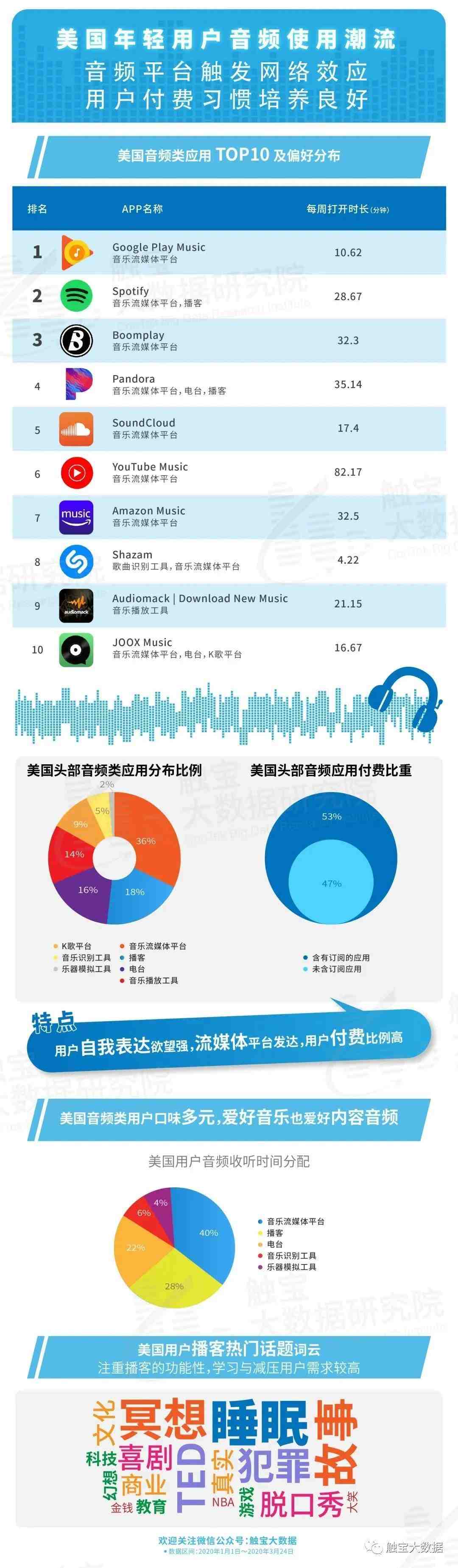 美国是音乐流媒体最为成熟的市场,可提供多元化订阅服务,当地的年轻用户受教育水平较高,很容易为优质内容进行付费,主要倾向于科普知识和悬疑类,他们产出的内容也更容易会传播到其他发达国家。