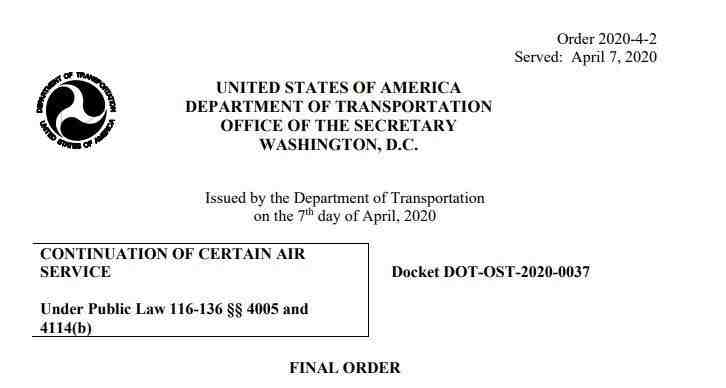 4月7日,美国交通部(DOT)公布了关于维持部分航空服务的最终命令。命令要求,除部分例外之外,那些根据美国《新冠病毒援助、救济和经济安全法案》(CARES Act)获得财政援助的航空承运人必须维持最低限度的航空服务。