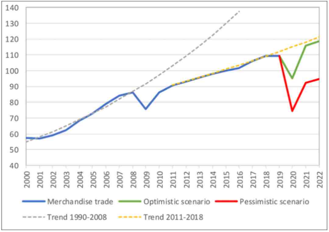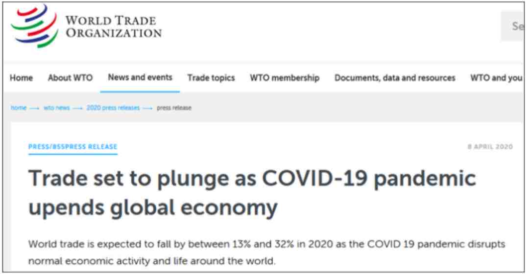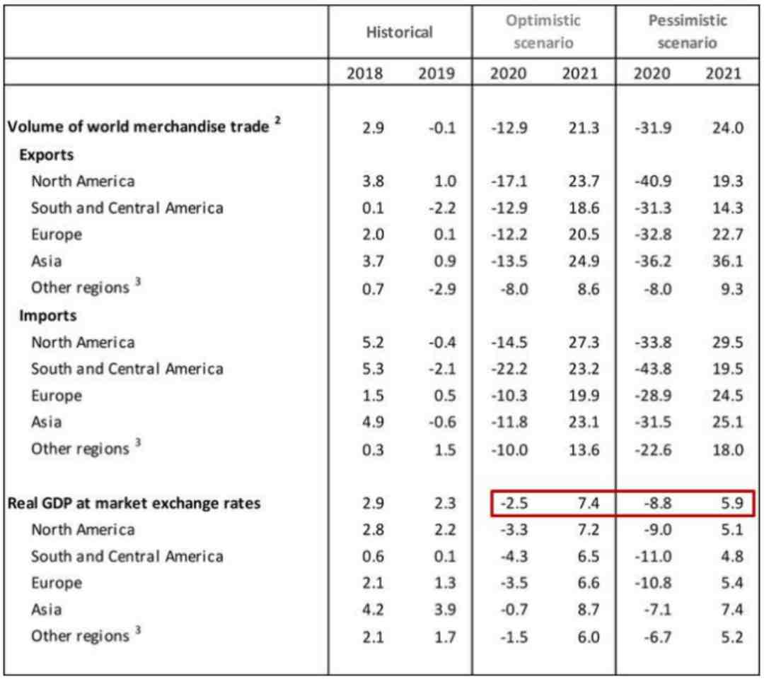 较为悲观的一种情况:全球商品贸易将在2020年下降32%之多,然后在2021年反弹24%;在悲观局面下,2020年全球GDP将可能萎缩8.8%,到2021年再增长5.9%。