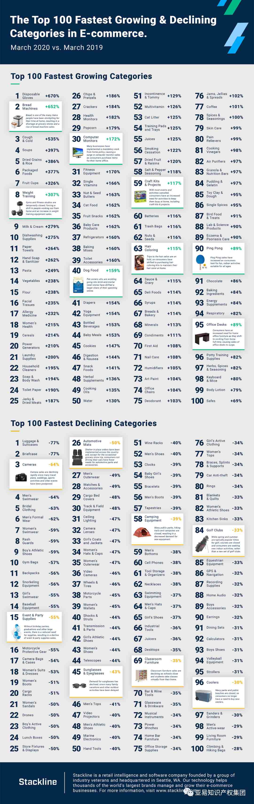 近日,知名调研机构Stackline发布了一份关于2020年3月,美国同比去年线上交易中,增长最快以及下降最大的100种类目。部分原本这个时候该热卖产品,销量却跌近谷底。