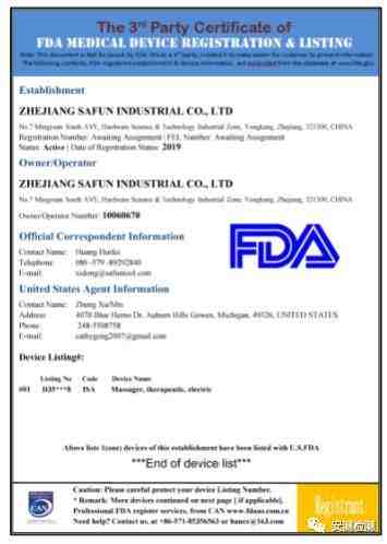 实际上,FDA注册是没有证书的,产品通过在FDA进行注册,将取得注册号码,FDA会给申请人一份回函(有FDA行政长官的签字),但不存在FDA证书一说。我们通常看到的这个证书是中介代理机构(注册代理)签发给厂家,以证明其帮助该厂家完成了美国FDA要求的“生产设施注册和产品类型注册”(Establishment Registration and Device Listing),完成的标志是帮助厂家取得了FDA的注册登记号。