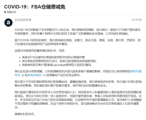 或许是考虑到了这一点,亚马逊于昨日宣布,将免除卖家在部分国家所储存产品两周的FBA仓储费。