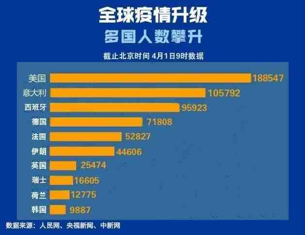 截止4月1日,全球新冠肺炎确诊病例已超过85万例。其中欧洲疫情不容乐观,多个国家新增确诊仍呈上升之势:意大利累计破10万,西班牙超9万,德国超7万,法国超5万,英国超2万。