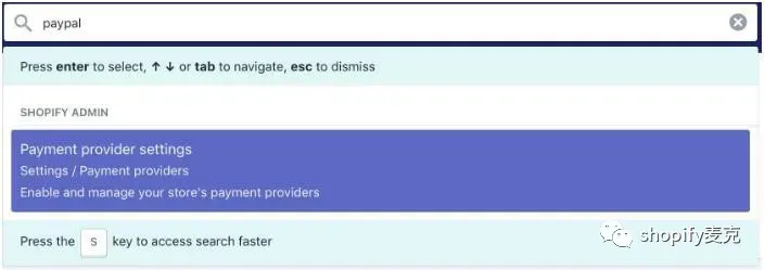 搜索功能:shopify网站后台的search是相当全能的,搜索范围覆盖面包括你自己的shopify网站后台的数据,以及shopify网站帮助中心的内容,shopify应用市场,主题市场的内容等等。你可以通过搜索框直接搜索你网站里面的产品,或者搜索关键词直接找到相关的设置位置。例如我找不到在哪里设置PayPal收款账户了,直接搜索PayPal,就可以找到答案。