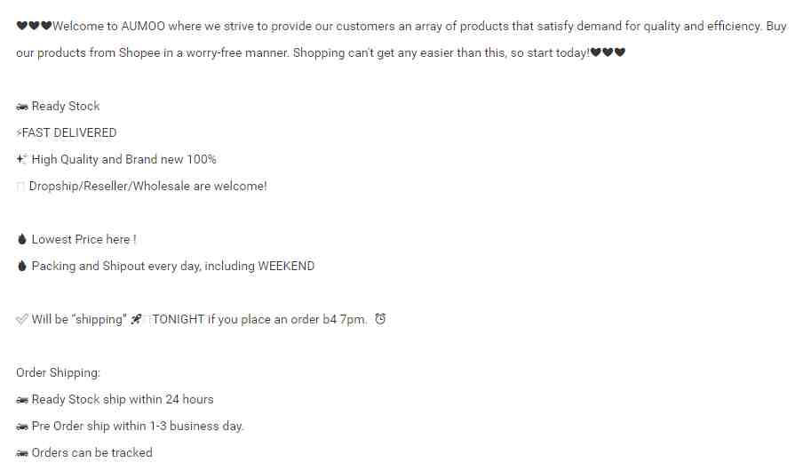 上图是shopee平台一家店铺的裤装卖家的产品描述,只列出部分。如果把文案细分来看看,一个优质的产品描述必须具备以下两点: • 高度概括,用多行短句为好。排版要有段落感,巧用字符表情但不要太多。提炼信息点、精准概括,将重要的信息往前放。 • 产品基本信息、产品优势卖点(加深了解)、产品痛点、包装详情、常见的问题与解答(答疑解惑,减少客服压力)。 买家好评 • 上架商品,一定要确保lisiting信息的准确性,避免货不对板。避免发错货以及包裹放置防撞包材。 • 已出单的产品第一时间去联系客户争取好评,订单结束15天内一定要提醒买家完成评价 ,产生差评30天内有一次修改差评机会。 • 评论内容最好要对其他用户具有参考价值,鼓励客户晒图评论,通过送优惠券,寄过去的商品有小礼物等。 • 第一单评价出现的时间点和评分对于初期店铺至关重要,如果想做关键词广告,尽量选择有评价的去做。 加购优惠 设置了加购优惠券的产品详情页面,将会显示”Add-on Deal”标签,且产品下方会显示主要产品设置了哪些加购产品。 说明白一点就是:如果买方要购买一种主要产品p,他们将获得Y%折扣的附加商品q。这会给店铺内其他产品带来了更多的点击,增加产品销量。 当然,关于其他的一些问题,比如店铺产品分类,这里也来说一说。 在后台的店铺分类中有增加自定义分类选项,建议设置一个hot sale分类(相当于热门活动)放在类目第一,Hot sale类目下推热销和主推产品。当然,给产品分类也能给买家提供更清晰的选择,方便买家购买。 关于优惠的话,可以用捆绑销售,套装优惠,或者最基本的按购买数量打折的方式进行。 总之呢,想开好一个shopee店铺,一定要保持listing的更新、优化、上新和下架。上新对流量和排名有帮助,shopee对上新有扶持。 还要优化表现一般和滞销的listing,比如加图加文字优化描述。出单正常的listing勿动。75天左右,如果没有出单的listing会删除(仅台湾站点)。关于shopee listing优化,今天就说到这,大家慢慢消化,如果有遗漏的内容,后期再补充。