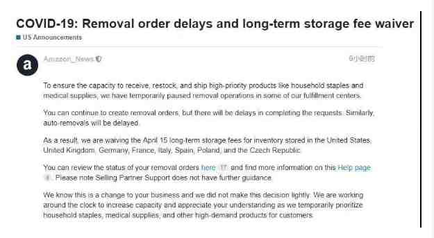 今天亚马逊又发公告,宣布暂时停止部分运营中心的移除操作,所以卖家要面临移除订单延迟、甚至被取消的情况了。相关公告如下: