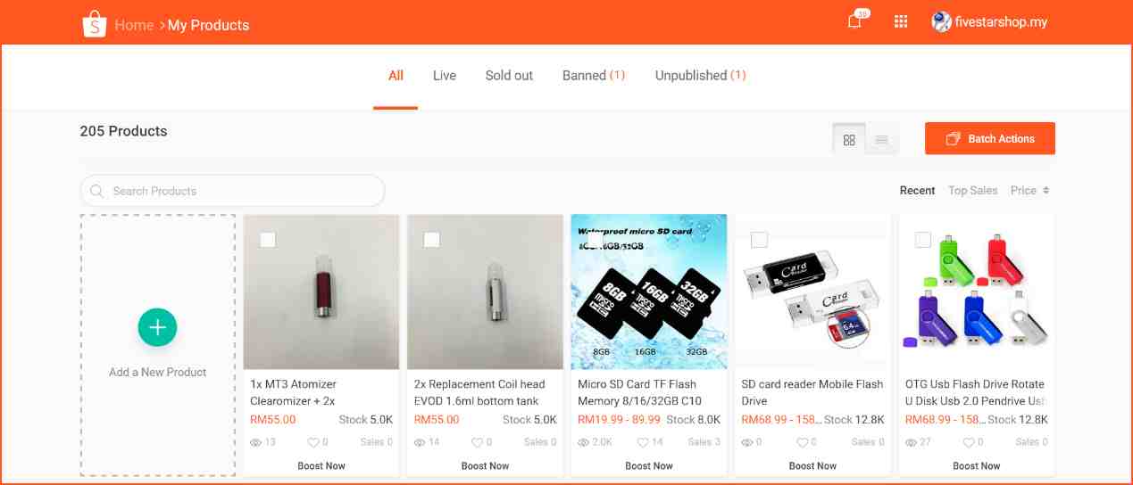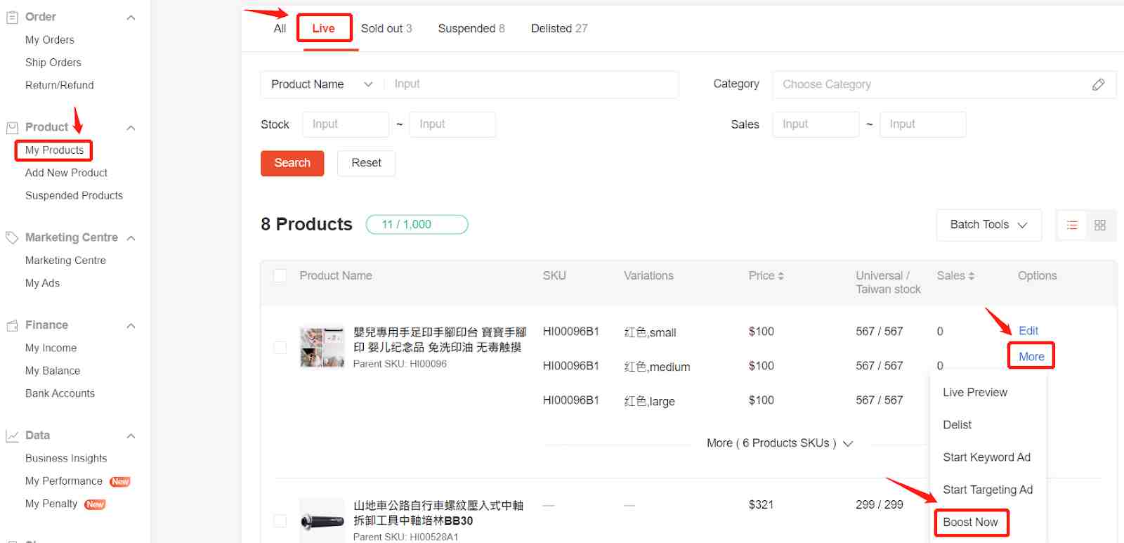 在【My Products】产品页面中,点击【live】查看在线售卖的产品。点击【More operations】中的【Boost Now】进行产品置顶,该功能卖家在点击boost之后,4个小时之内不可再次点击 。(每次可曝光5个SKU)