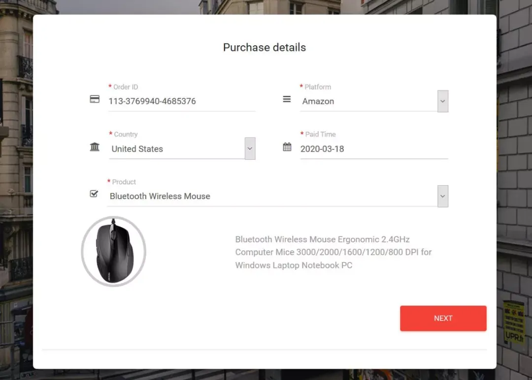买家看到保修网站,进入落地页,提交姓名、订单号、邮箱基础信息,进行身份验证,验证成功,则到达信息确认页面
