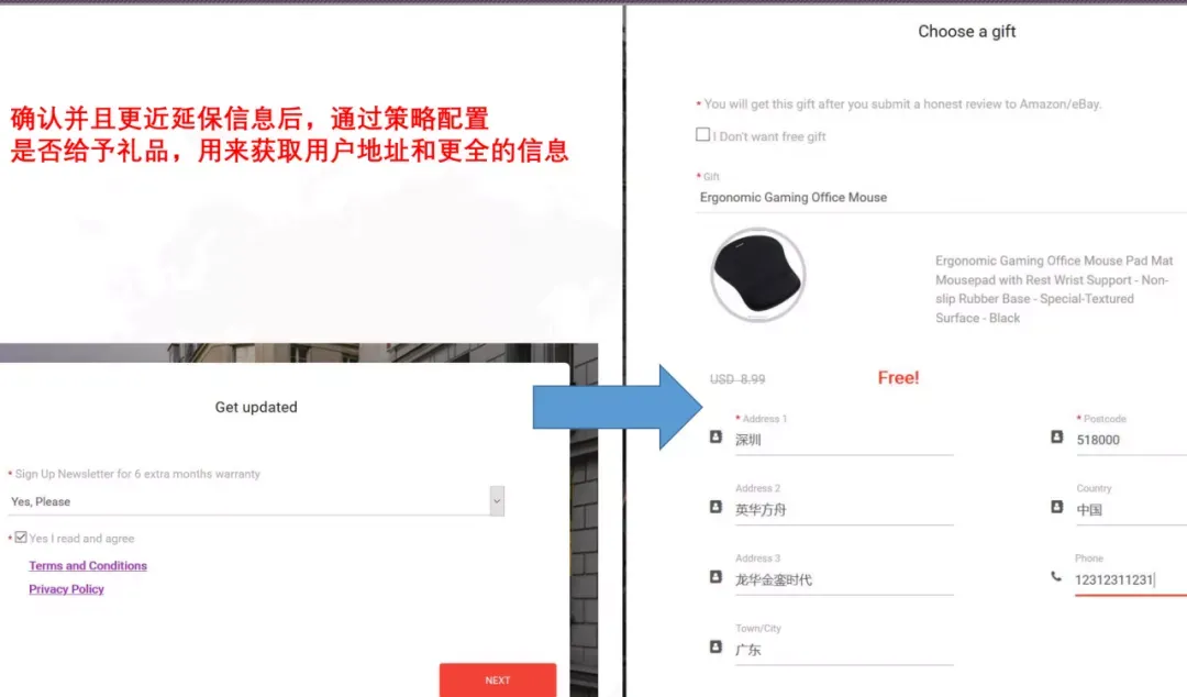 经过深入调研,我们发现,很多大卖都有自己的官方品牌售后网站,他们会以各种方式将网站展示给真实购买的买家,买家看到延长售后保修期等增值服务后,会主动登录网站,并按照引导留下邮箱,开通增值服务。另外,如果想要获取其他免费礼品,则需要留下评价。