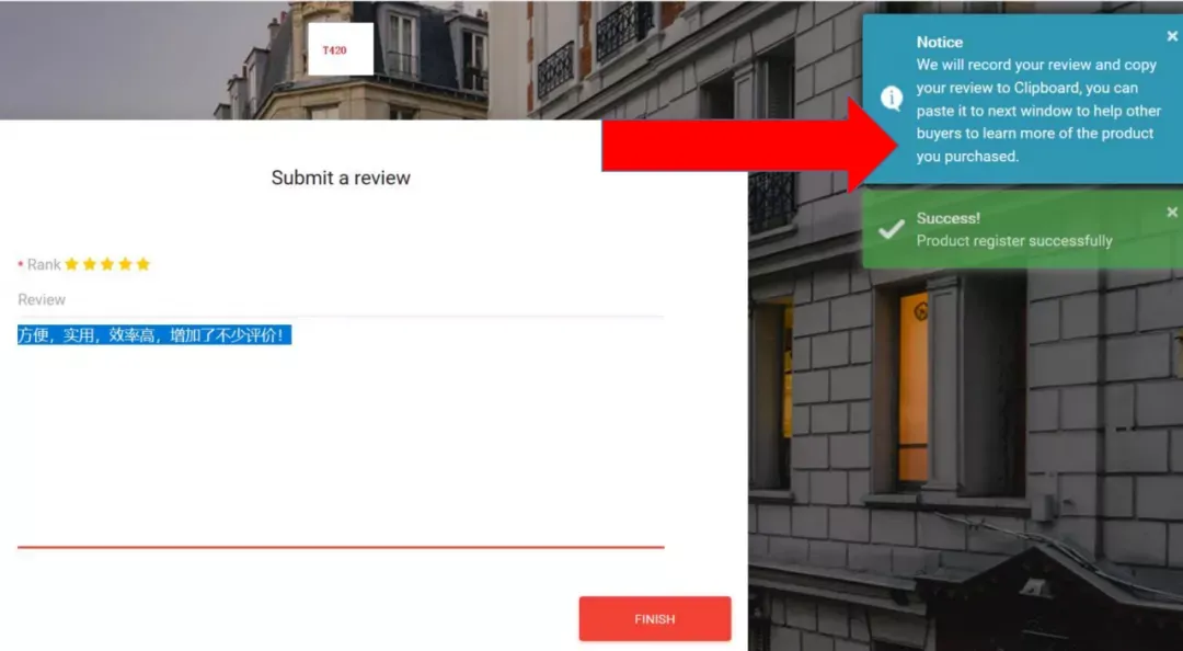 买家选择礼品后,进入留评打分页面,引导买家进行星级勾选和内容评价,若评分是4星以上,则在网页完成留评后,会自动复制评价内容并跳转到亚马逊留评页。若是评分为4星以下,则自动调过留评环节,申请成功。