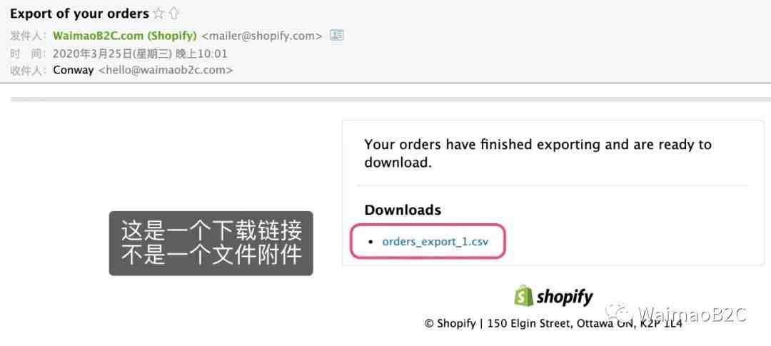 打开邮箱可以看到Shopify发送的客户数据的邮件,有没有发现,邮件中显示的“orders_export_1.csv”其实是一个指向Shopify服务器的下载链接地址,而不是邮件附件?!那这有什么问题吗?问题就在于,如果这是一个附件的形式存在的,那客户数据是存储在你的邮箱服务器里面的,只要邮箱能打开,你随时可以下载这个文件。但是如果是指向Shopify服务器的一个下载链接地址,那么文件本质上还是存储在Shopify的服务器上的,虽然我这里有下载链接,但是如果今晚我的Shopify网站挂掉了,那么明天,我是无法打开这个链接下载客户数据的!