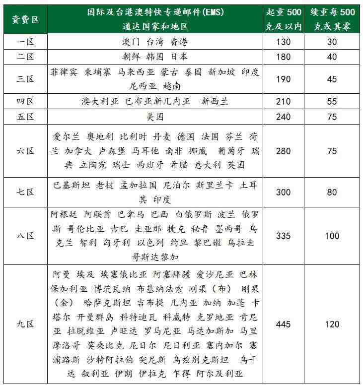 答:个人寄递国际及港澳台EMS业务,参照以下价格表收费: