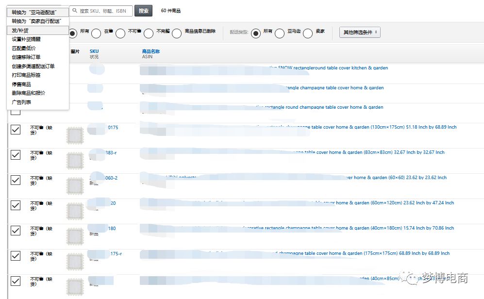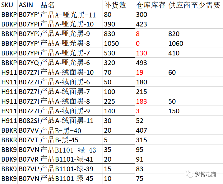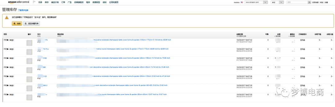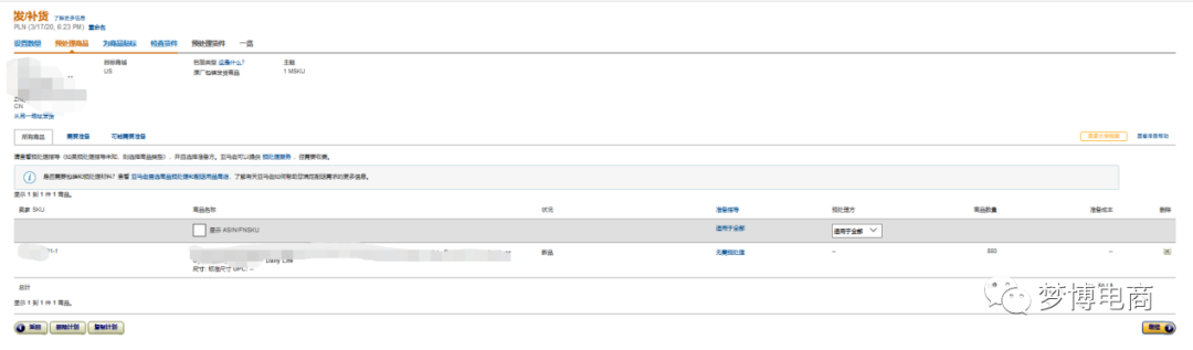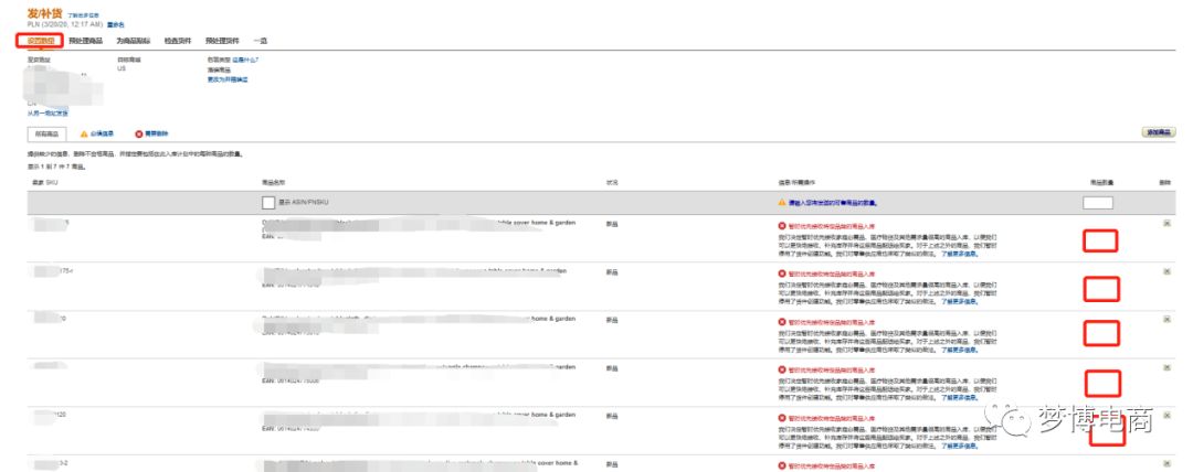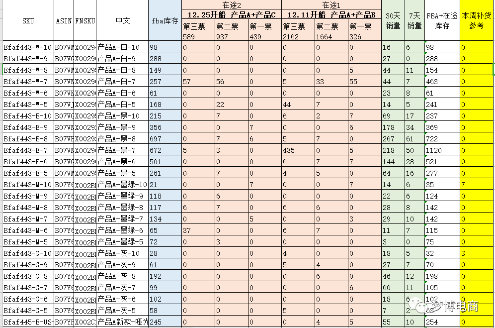 为了资金周转以及维持一个动态库存(在途库存和FBA库存能维持N天的销量),每周都需要补货,我们选择的是海派,特殊情况会补空派或者快递(紧急缺货的情况才不得不选择成本高的物流方式)以下讲述本公司的美国站最常见的每周海派的各个环节:运营计算发货数据--主管审核发货数据--运营创建出货计划并发布发货数据--仓库接收发货数据--仓库反馈装箱数据--运营接收和填写装箱数据--仓库粘贴外箱单--物流公司拉货以及财务报关资料的制作以上这些环节就是我认知中的海派发货流程,下文将开始一一详解,希望对亲力亲为的小微企业能起到借鉴意义,欢迎指出环节中可以完善和补充的需要。计算思路:补齐在途库存 以至于其加上FBA库存能够维持50天的销量需要下载的表格:《管理亚马逊库存》、《业务报告》子商品7天和30天的销量下载途径:1、数据报告/库存和销售报告/库存/管理亚马库存/下载(需要大约十几秒的缓存时间后才能点击下载报告) 2、数据报告/业务报告/子商品详情页面上的销售量与访问量/选择日期范围7天以及30天的下载《业务报告》(注意结束日期选择当前日期前两天,比如今天中国时间19号,后台就要选择17号才会有数据)找到管理亚马逊货件中的在途货件:这个希望大家每发一批货就记录在一个专门的表格中,包括发货时间和预计到货时间以及各个SKU的发货数量,这就知道了店铺产品在途数量。以上提到了两个表格分别是FBA实时库存和销量情况,再结合在途数量我们可以制作出一个计算发货数的表格:首先做个店铺产品的SKU/ASIN/FNSKU对照表本周补货参考:补足约50天销量库存=7*7天销量-(FBA+在途库存)以上出来的发货数据是参考值,挑出需要发货的SKU,然后参考本地仓库的实际库存情况来对发货数据进行考量:可以让仓库主管发你当前产品的库存,我们是用ERP记录库存,所以运营可以直接上ERP查询,填入发货的表格中。注:补货数是根据上面得出的“本周补货参考”取整,仓库库存不足的标红(注意仓库库存数量包含了次品数,所以需要减掉几双),算出向供应商获取的最少数量,我们向工厂请求某些sku先发小批量过来应急,等工厂反馈数据后,才能得出一个比较准确的发货数。主管针对准确的发货数进行审核并提出建议,最终把能发的准确数量发给运营去安排执行。运营根据最终准确的发货数量,在后台创建出货计划,出货计划的创建完成需要分成两部分:确定发补货SKU数量确定亚马逊仓库+确定装箱数量完成货件。前半部分我们之前一向手动选择SKU并一个一个填写数量,后来发现有批量上传模板填写,上传完成后在后台手动确认数量和仓库并继续,如果SKU较多的情况下可以尝试一下。以下介绍原先在后台是怎么创建出货计划的前半部分: 库存/管理库存/展开父变体,可以利用快捷键Ctrl+F查找选中(记得一定要选中FBA的listing,不然到下一步会重来,大家可以在前一步选中“亚马逊配送类型”)勾选完后点击搜索框旁边的按钮,再点击“发/补货”,会自动跳转到下个页面点击黄色按钮“是,继续” 系统提示几秒钟后会自动定向到“发/补货”界面