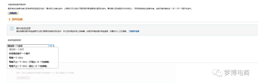 这就到达了货件计划的后半部分,就是装箱之后才能开始进行的:这里是预处理货件,检查并修改商品点开可以对每个SKU进行小幅度的数量调整,选择承运人信息根据装箱数以及是否混装情况来选择货件包装,不超过15箱的需要填写箱数然后在本界面填写装箱数据(数量、重量、尺寸),超过15箱的需要填写箱数然后下载模板填写装箱数据,之后上传,上传成功后点击打印箱子标签发给仓库,然后点击完成货件即可。完成货件之后,运营将外箱单发给仓库打印,提醒仓库人员不要忘记货代的箱贴以及超重标,仓库主管不在时,亲自下去看着他们操作,千万不能贴错,不然前功尽弃。 将发货的方数预报给货代,定好日期来取货,将发货数量、重量、货件编号、仓库地址发给财务做报关资料,运营也需要记录这票货的相关信息,及时备注,之后在计算在途库存时候也会用得到。