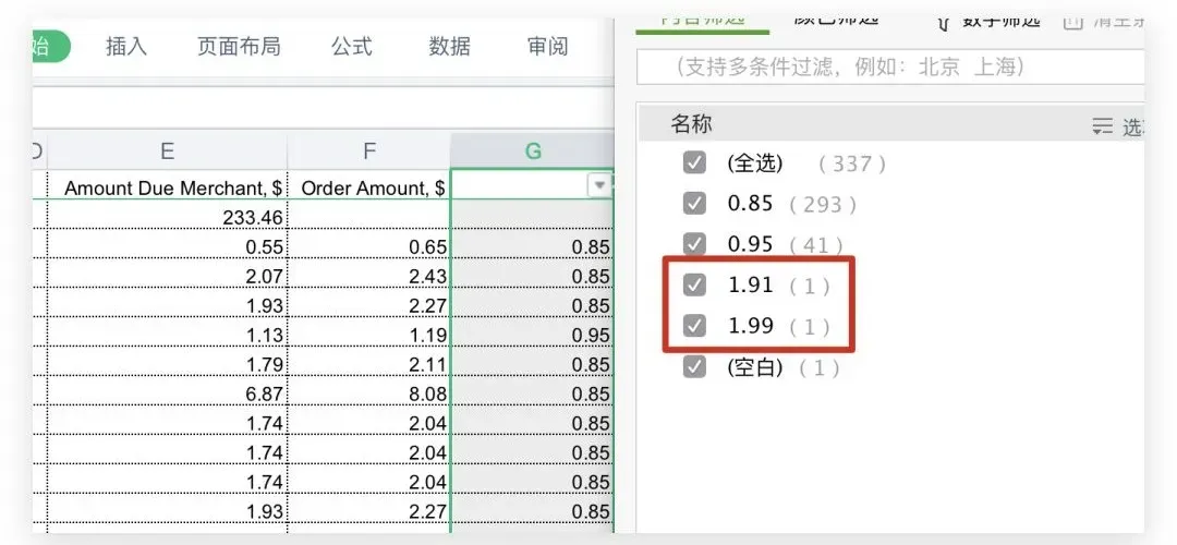 通过筛选功能,可以快速找到0.85和0.95以外的数值(不要问我为啥是这样,因为Amount due merchant是卖家扣除佣金到手的钱,Order Amount是订单金额),这些订单行筛选出来就都是补运费的啦。就问你简单不简单