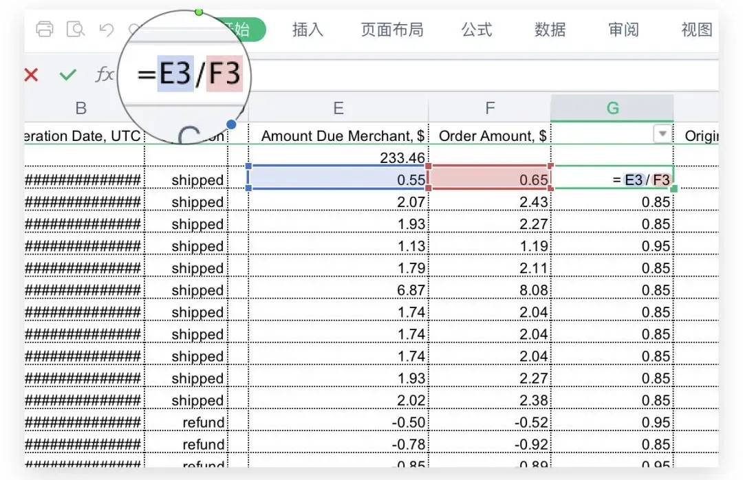 5. 还有一个办法之前跟大家讲过,也可以快速定位到补偿运费的订单。在F列右侧插入一列,写公式=E3/F3(公式中数字对应当前行数,Excel相信大家都会就不多解释了),之后把公式应用到整列。
